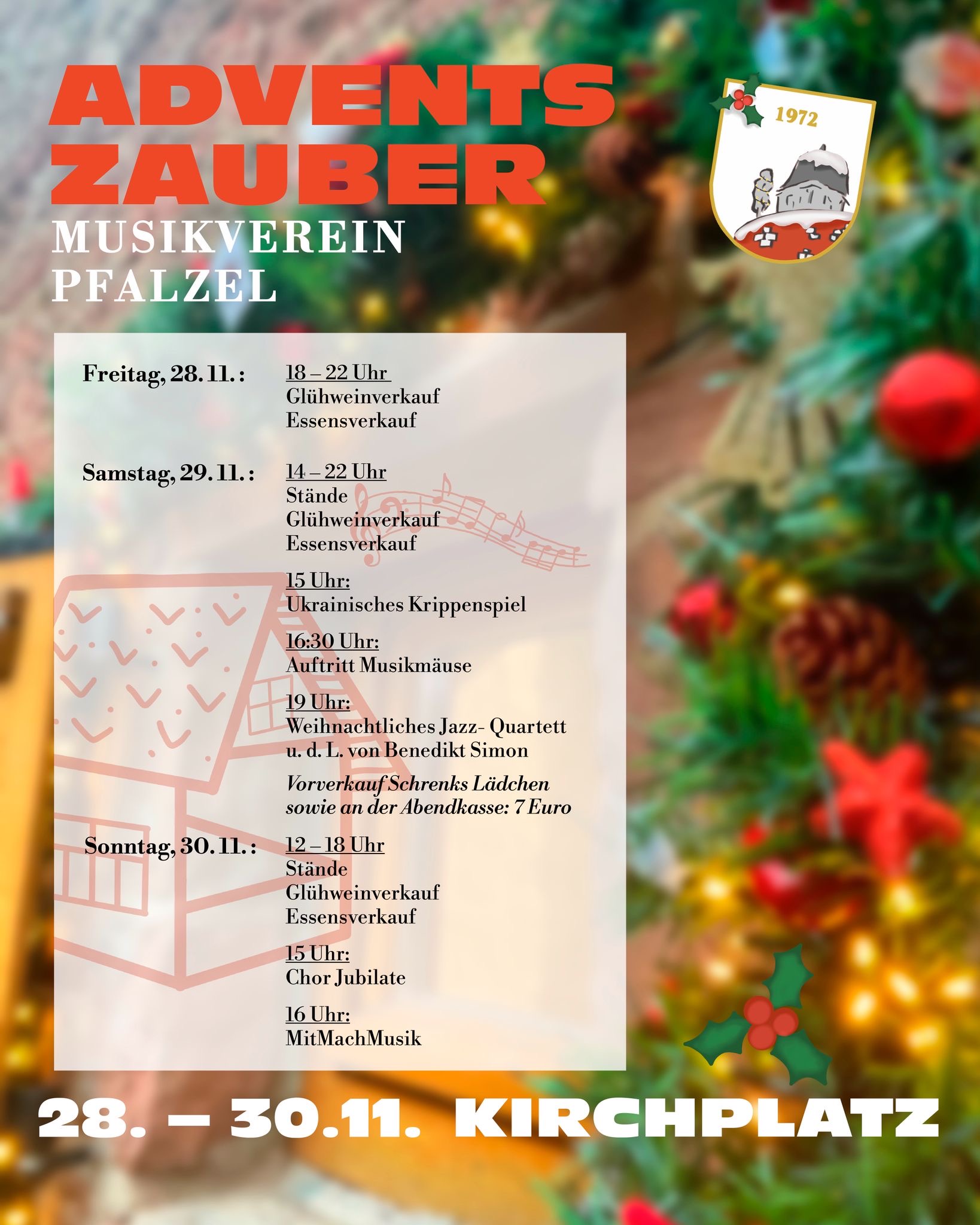 Auch in diesem Jahr lädt der Musikverein Pfalzel herzlich zum Adventszauber auf den Kirchplatz ein. Vom 28. bis 30. November erwartet Besucherinnen und Besucher ein stimmungsvolles Wochenende voller Musik, Lichter und winterlicher Atmosphäre.